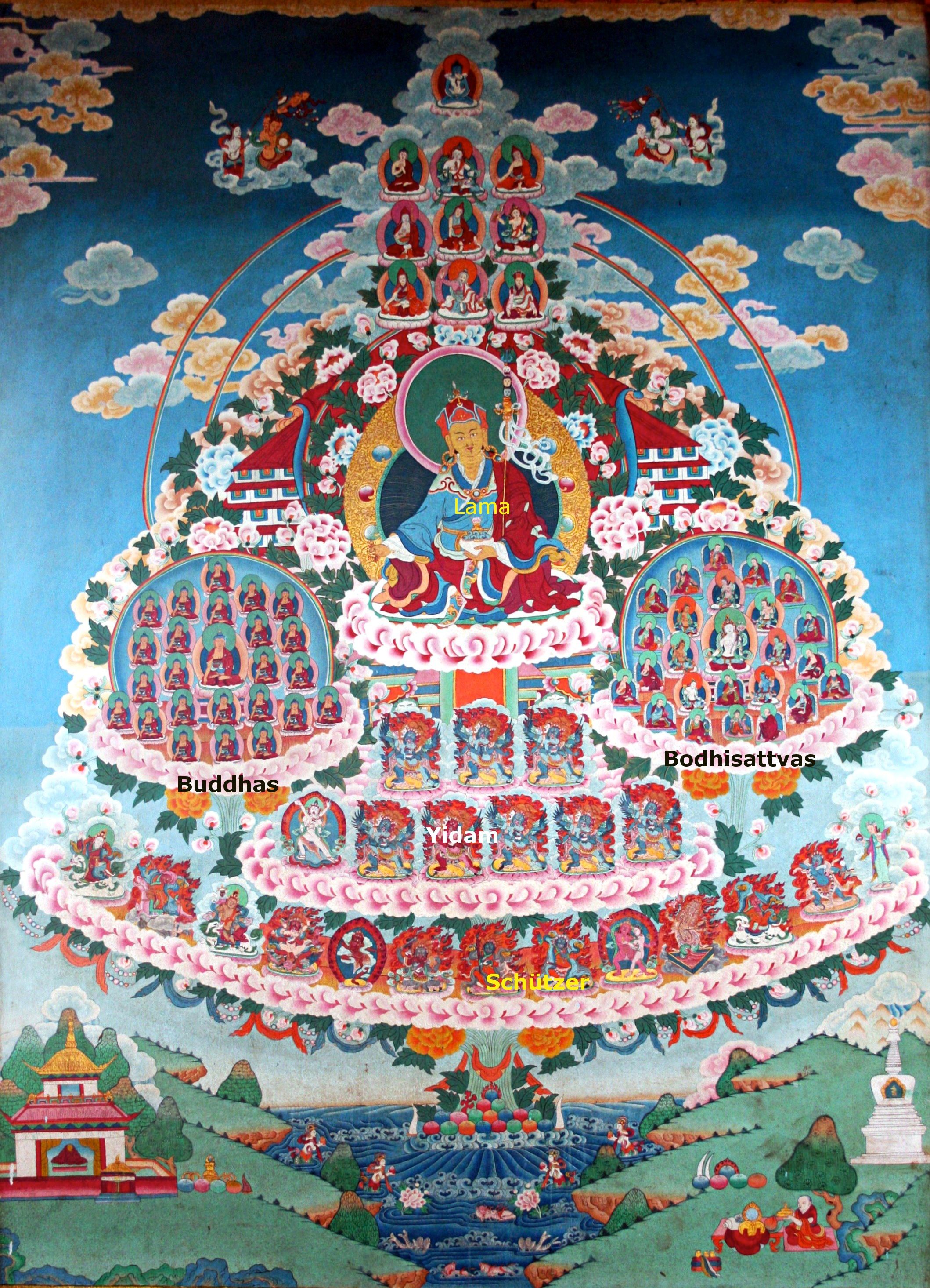 Arbre Refuge - Lama, Yidam, Protecteurs, Bouddhas, Bodhisattvas (habituellement, il y a des enseignements sous la forme de livres derrière le Lama)